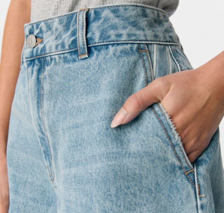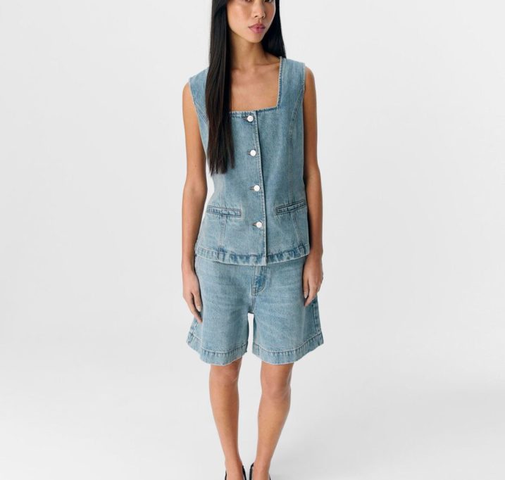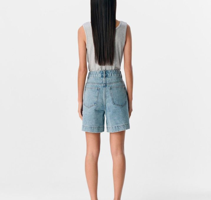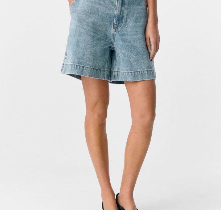 DESCRIPTION: Mid waist denim shorts – Belt loops – 5-pocket design – Zip fly with rivet button fastening – Loose fit