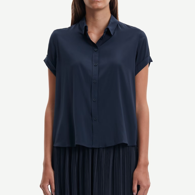 DESCRIPTION: Short-sleeved shirt with a regular fit. Button closure on the front. Neck yoke seam with pleated detailing. Main material made from an elastic LENZING™ ECOVERO™ viscose-blend. This product contains LENZING™ ECOVERO™ Viscose, certified with the EU Ecolabel for meeting high environmental standards.