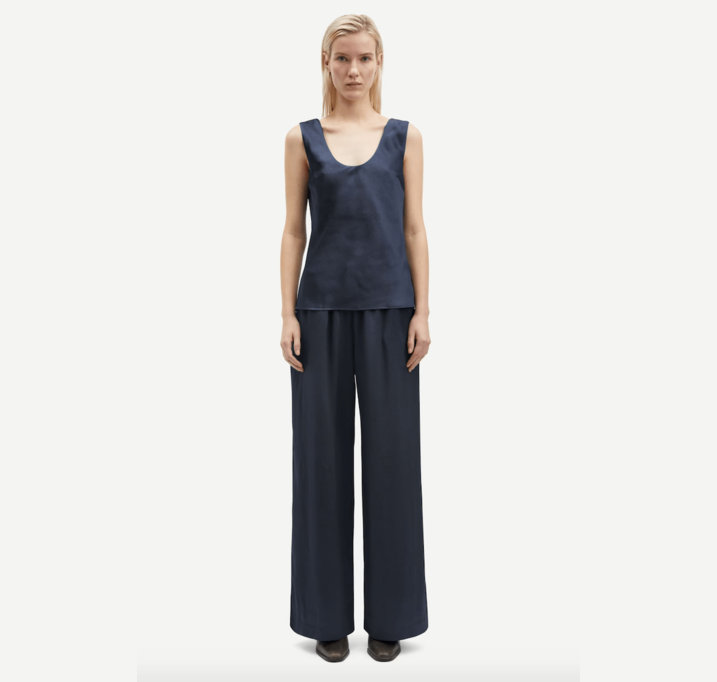 DESCRIPTION:Mid-waist trousers with a loose fit and long leg. Elastic drawstring closure. Side slit pockets on the front. Main material made from an elastic blend of recycled polyester. This product is GRS certified. Each stage of the supply chain has met strict social, environmental, and chemical requirements.