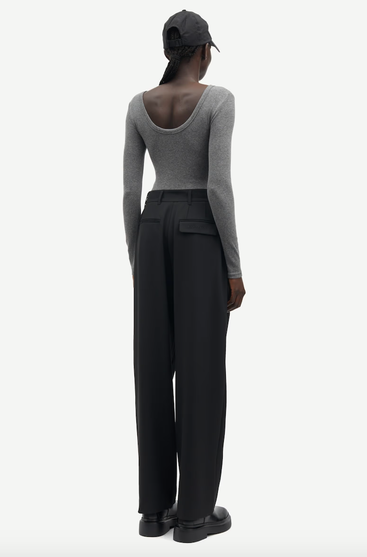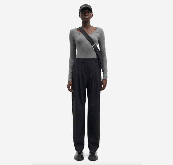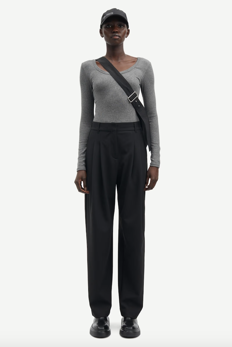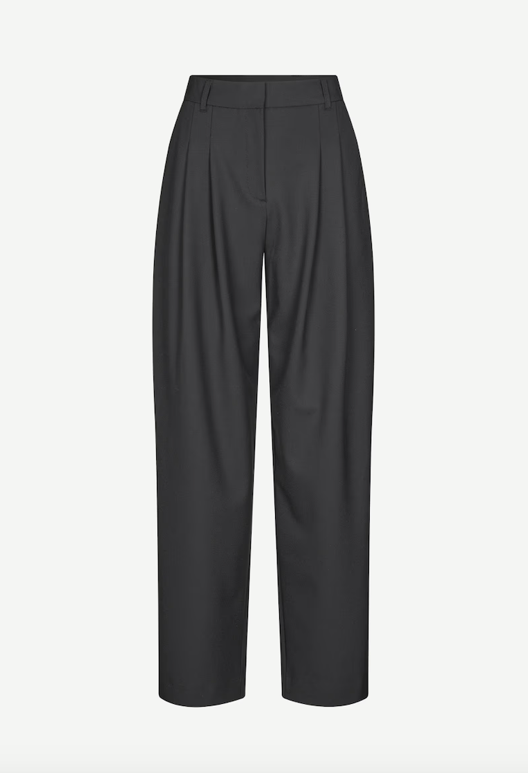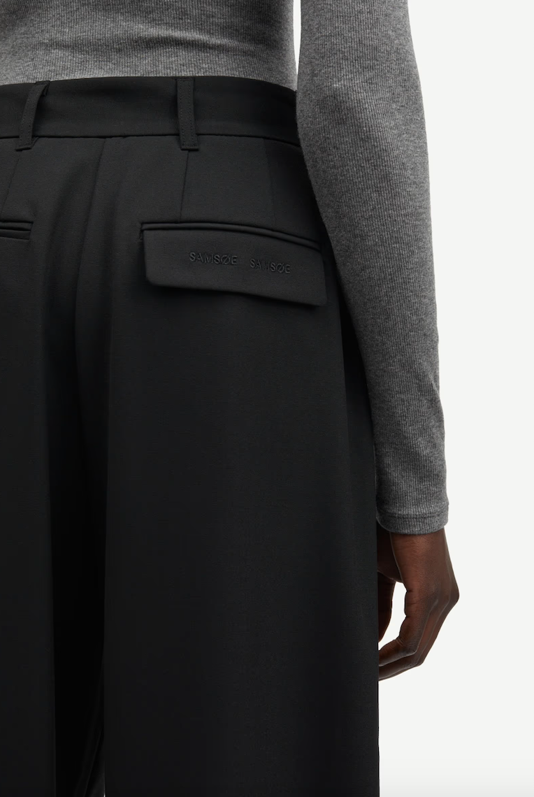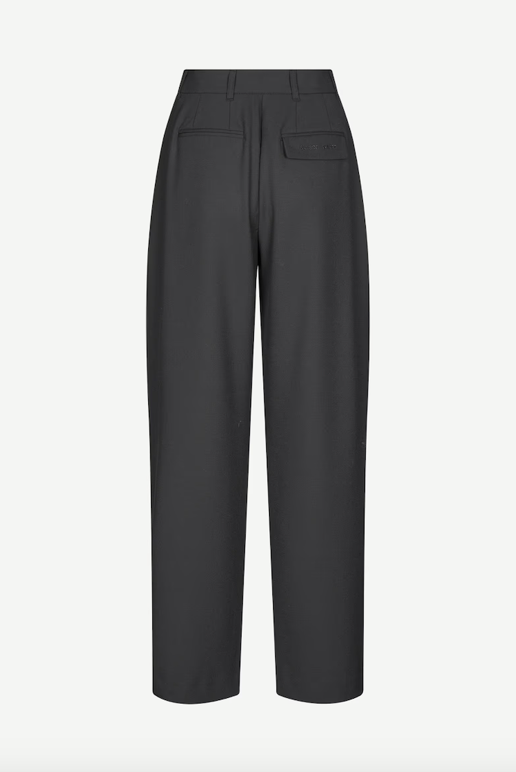 DESCRIPTION: High-waist trousers with a regular fit and tapered leg. Button and hook closure on the front. Side slit pockets on the front and a welt pocket on the back. Belt loops. Pressed creases on the front. Embroidered Samsøe Samsøe logo on the back. Main material made from an elastic blend of recycled polyester and LENZING™ ECOVERO™ Viscose. This product contains LENZING™ ECOVERO™ Viscose, certified with the EU Ecolabel for meeting high environmental standards.