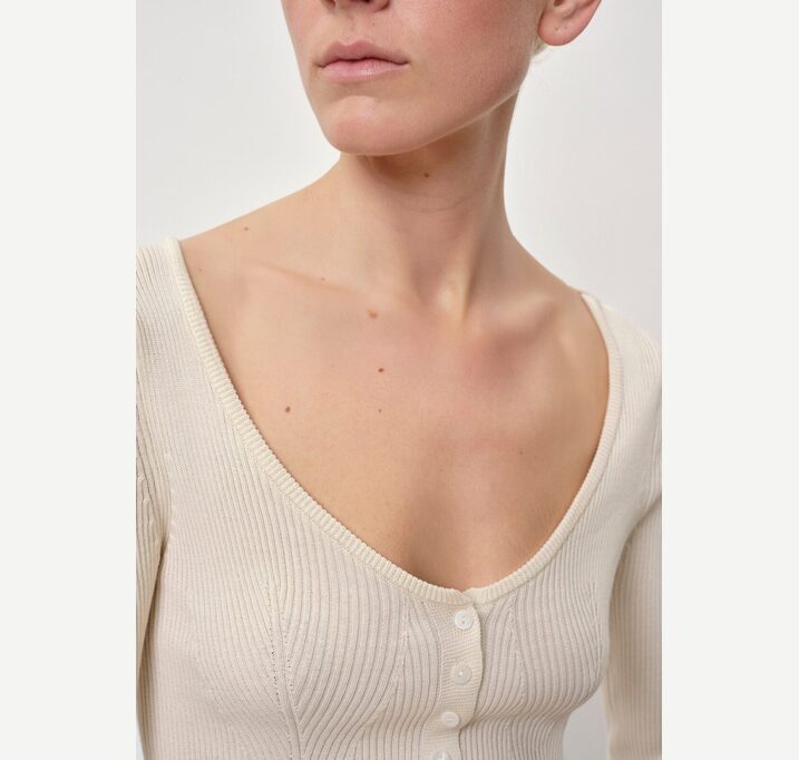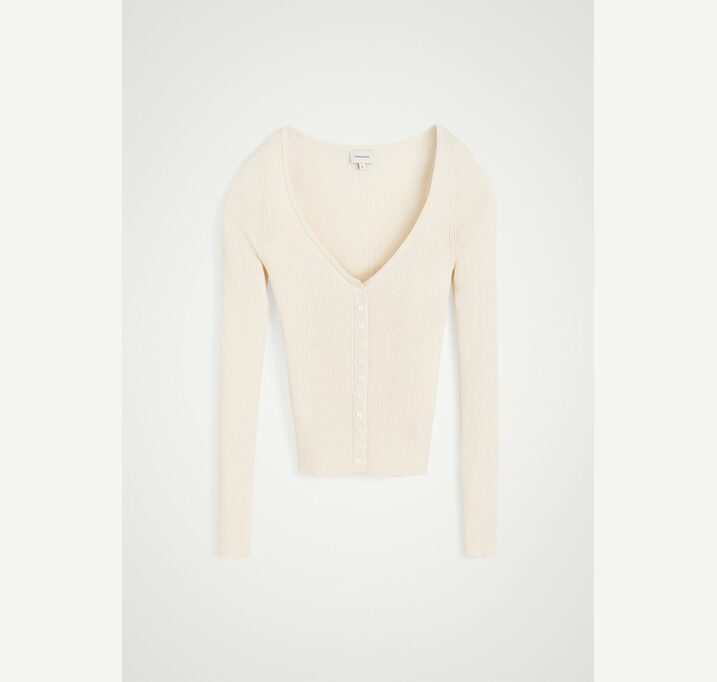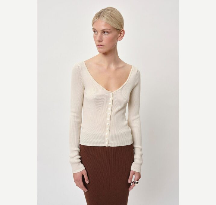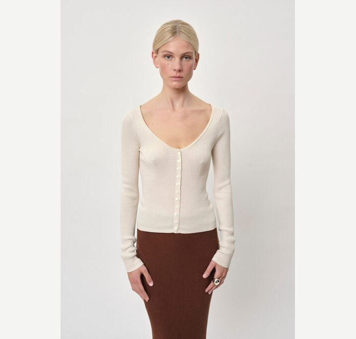 DESCRIPTION: Introducing the Gili Knit Blouse: A fitted knit cardigan featuring a ribbed texture, a deep neckline, and a button closure at the front.