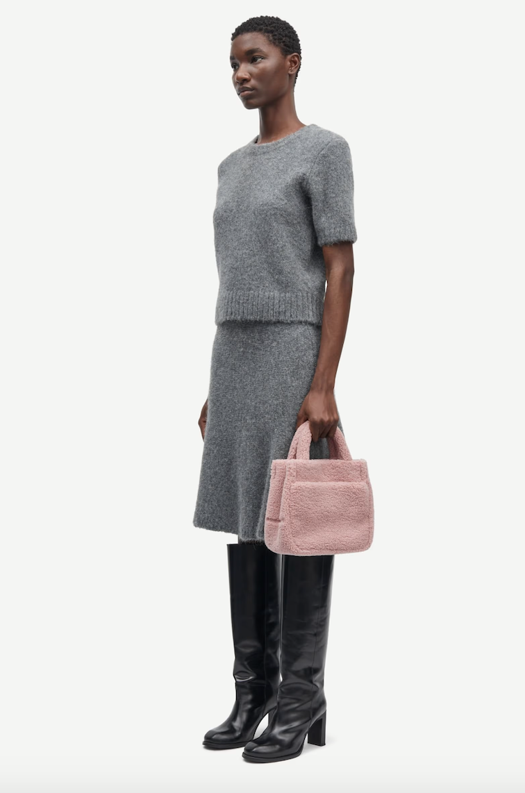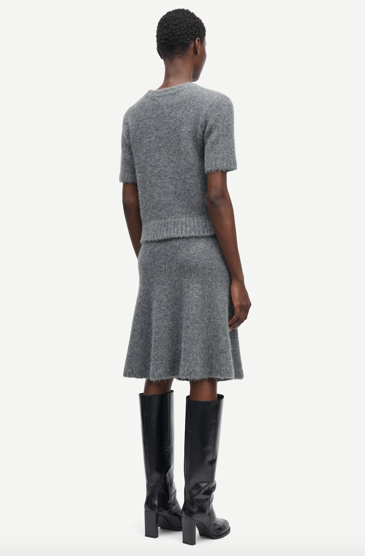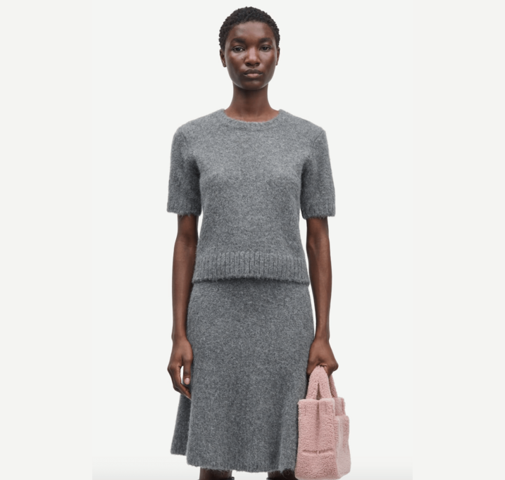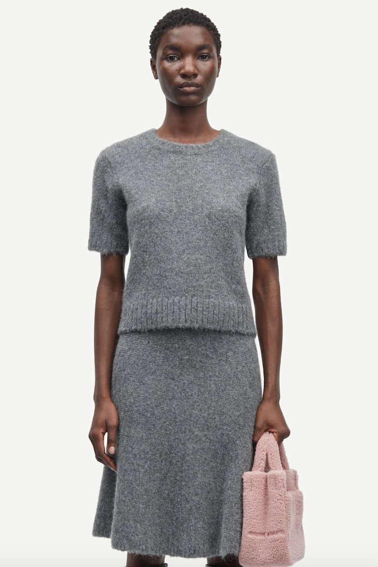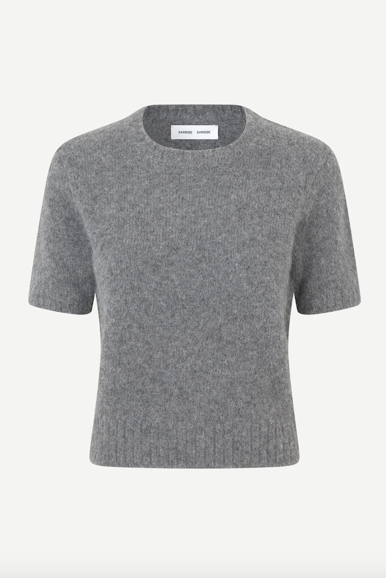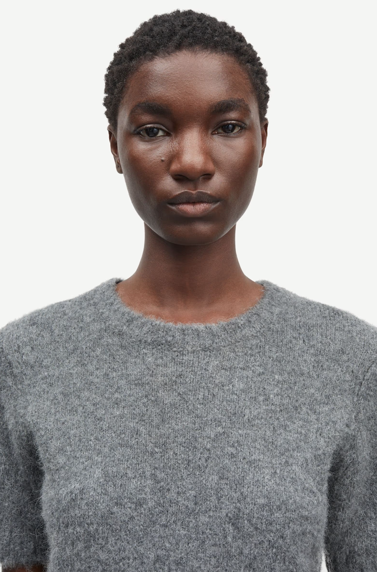 Short-sleeved sweater with a regular fit and cropped silhouette. Rib-knitted collar, cuffs, and hem. Round neck. Brushed look. Main material made from an elastic blend including alpaca wool.