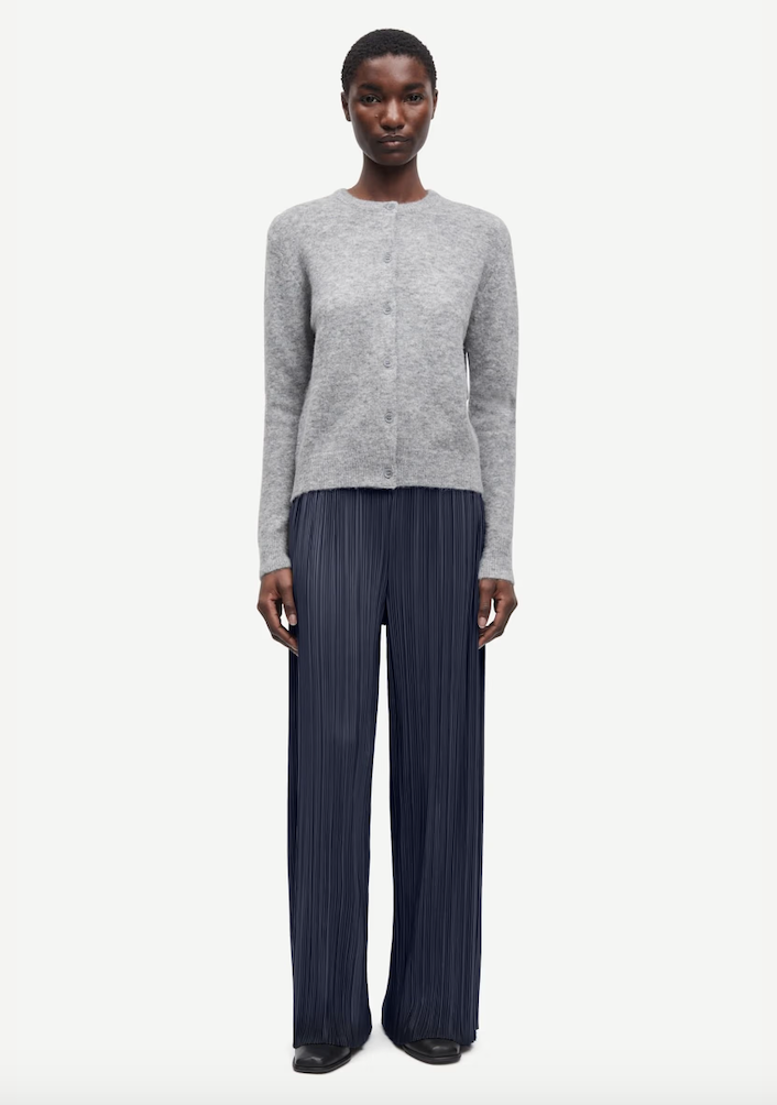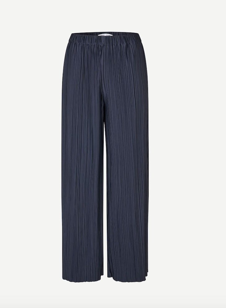 DESCRIPTION: Finely pleated jersey trousers with a loose fit and wide leg. Elasticated waistband. Side slit pockets. Main material made from a recycled polyester-blend. This product is GRS certified. Each stage of the supply chain has met strict social, environmental, and chemical requirements.