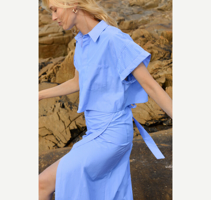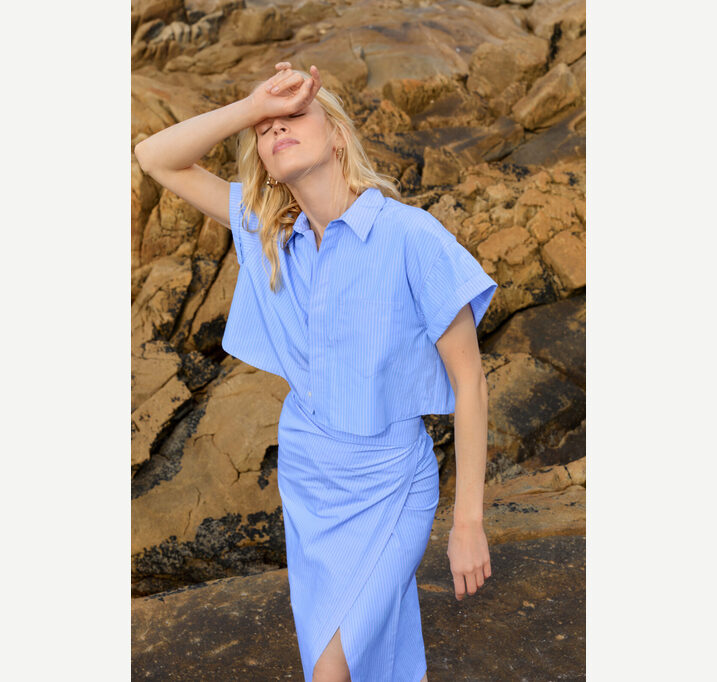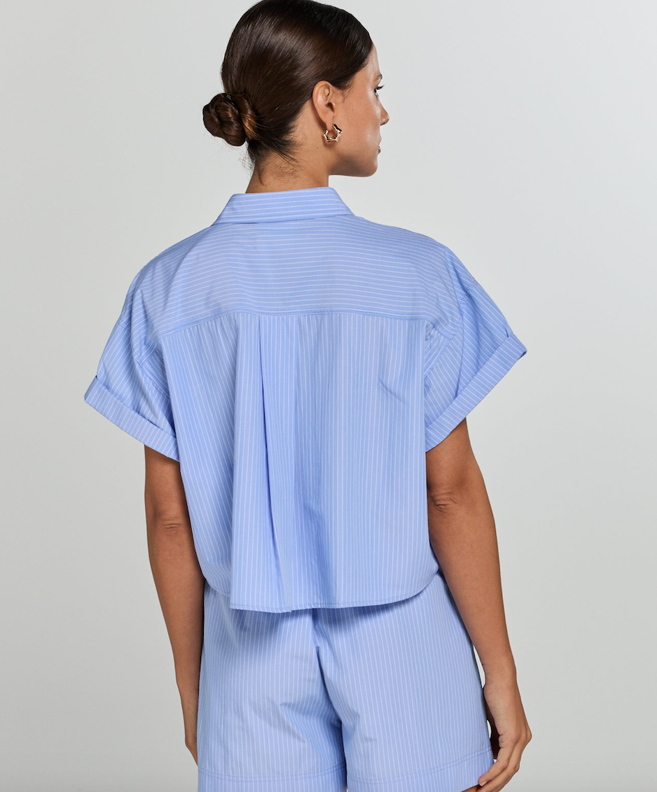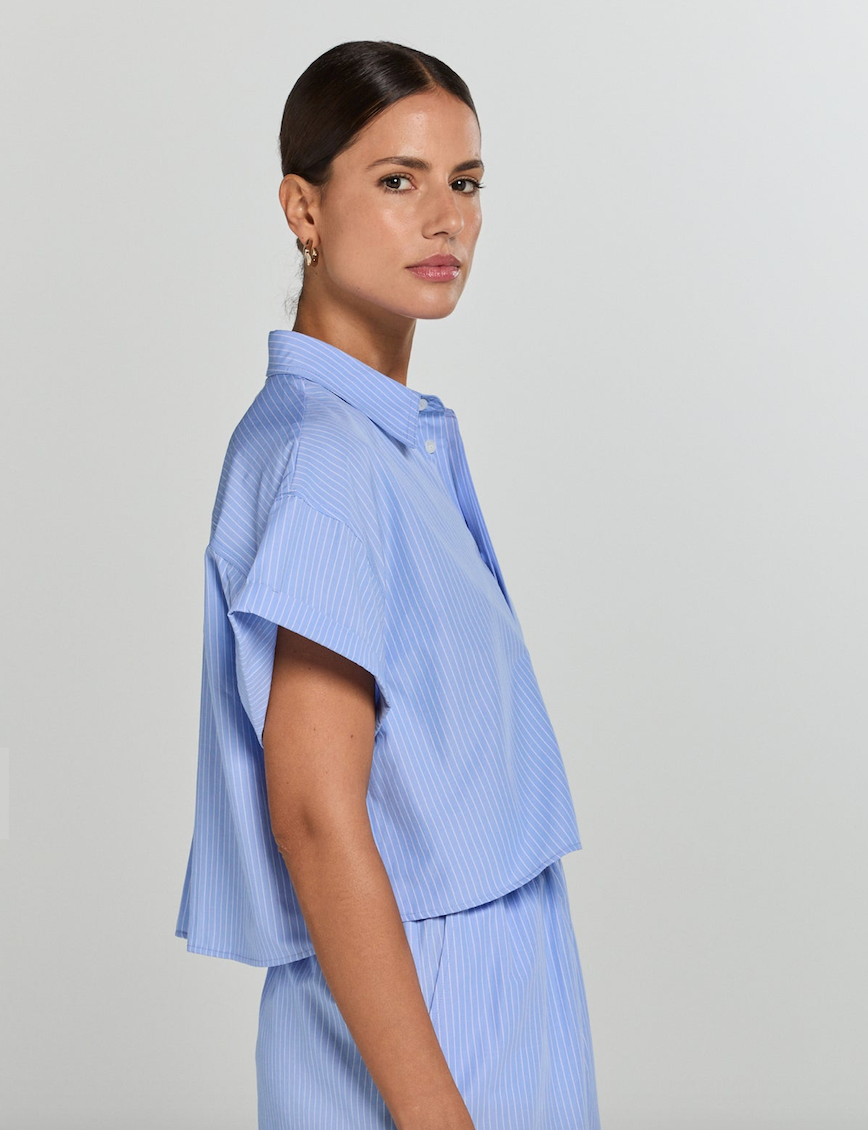 DESCRIPTION:Meet the Eloise blouse, a modern take on the classic button-down. This cropped shirt in blue striped fabric features short sleeves and a timeless design, making it a versatile addition to your wardrobe.
