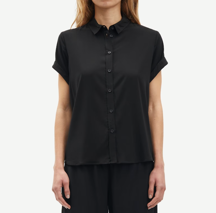 DESCRIPTION: Short-sleeved shirt with a regular fit. Button closure on the front. Neck yoke seam with pleated detailing. Main material made from an elastic LENZING™ ECOVERO™ viscose-blend. This product contains LENZING™ ECOVERO™ Viscose, certified with the EU Ecolabel for meeting high environmental standards.