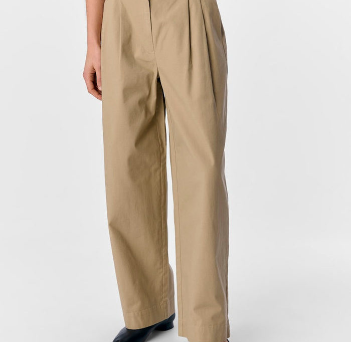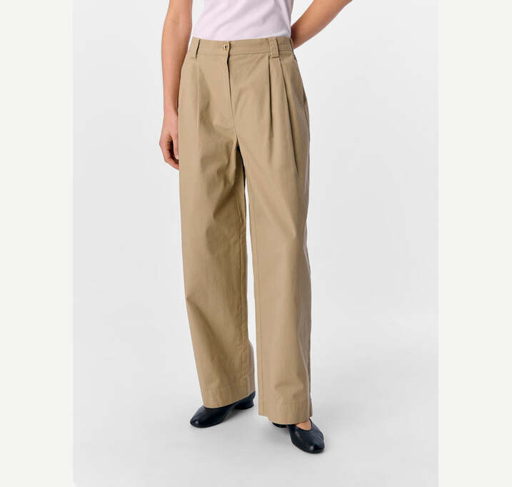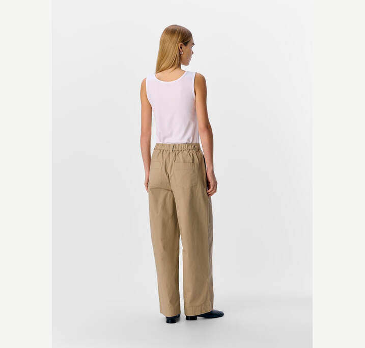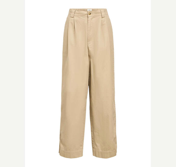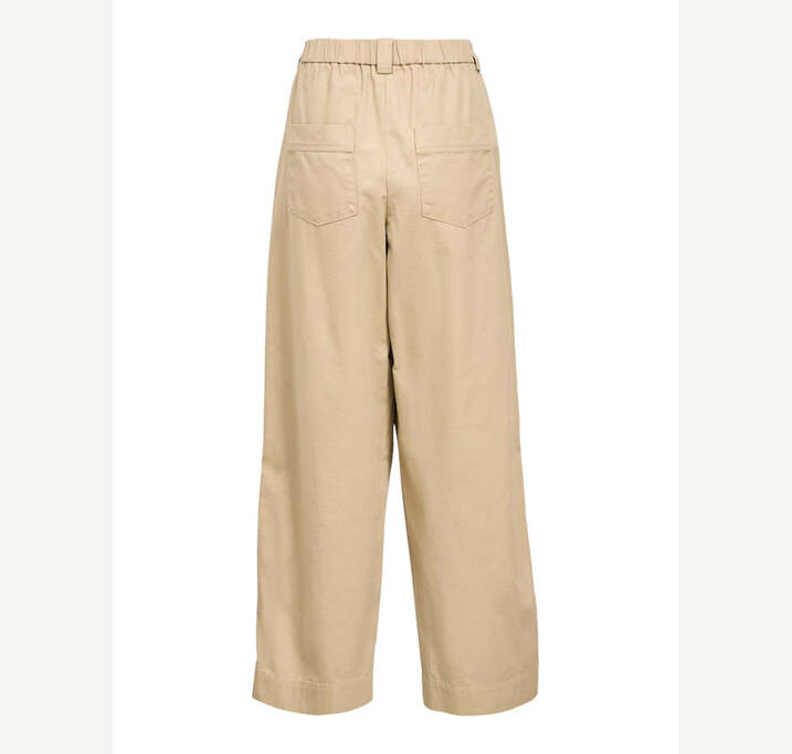 DESCRIPTION: A classic “barrel pant” has arrived, which is a type of pants that has a loose and roomy fit around the hips and thighs, but gradually narrows down towards the ankles. The name “barrel” refers to the rounded silhouette, which gives the pants a slightly balloon-shaped appearance. The pants are in a lovely sand color and have elastic at the waist at the back, as well as pockets at the front and back. They have a gold button and zipper at the front and nice pleats and belt loops. The pants are high-waisted, which gives a nice focus on the waist. Object Meilin Barrel Pants – are the perfect summer pants that can be used for almost everything. They are cool with sandals, heels or sneakers.