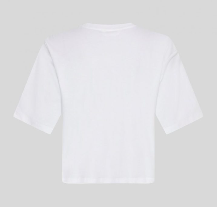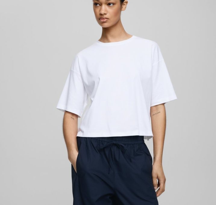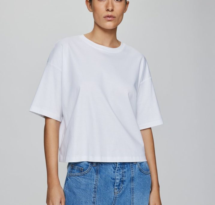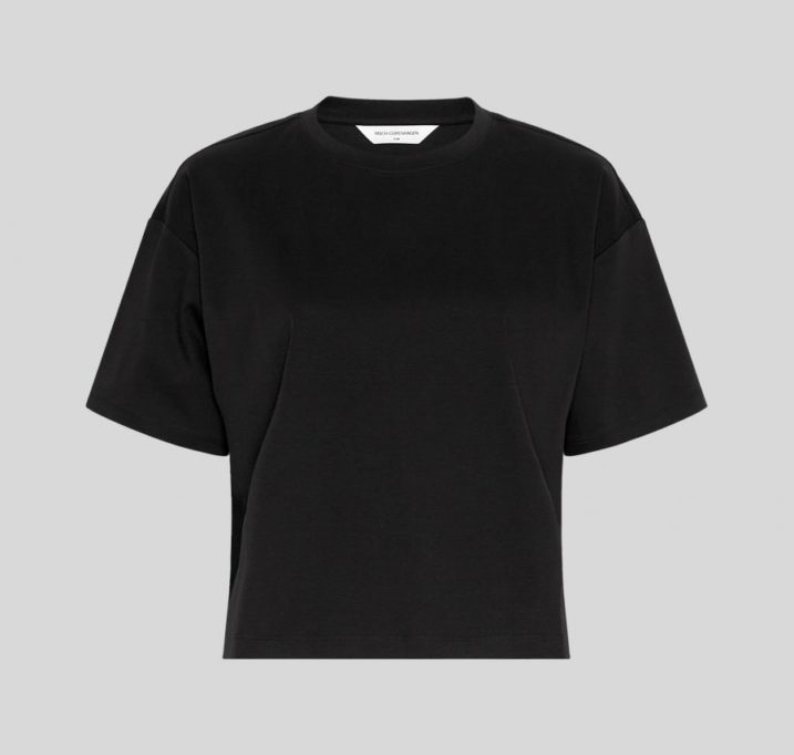 Our Moa Melea tee is a boxy fitted basic tee, that you can wear over and over again. The T-shirt has a classic round neckline and a “long” sort sleeve with dropped shoulders.