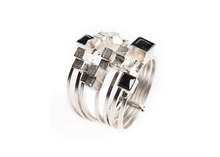 This stacked seven-piece ring was designed in atelier Lore Van Keer in Belgium. The abstract elements of black semi-precious onyx and silver ensure a playful twist.