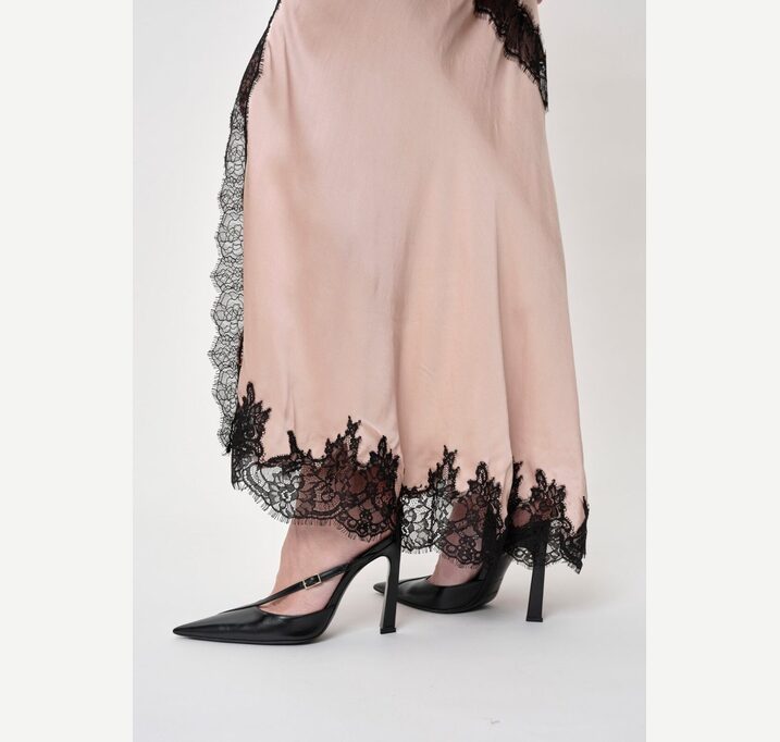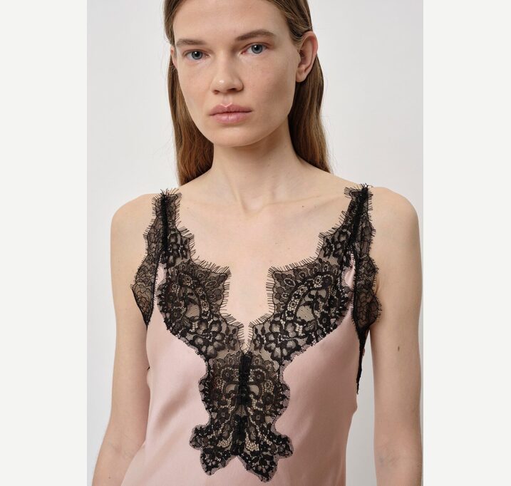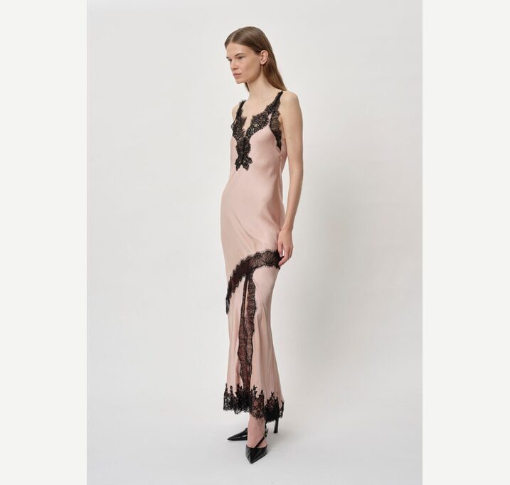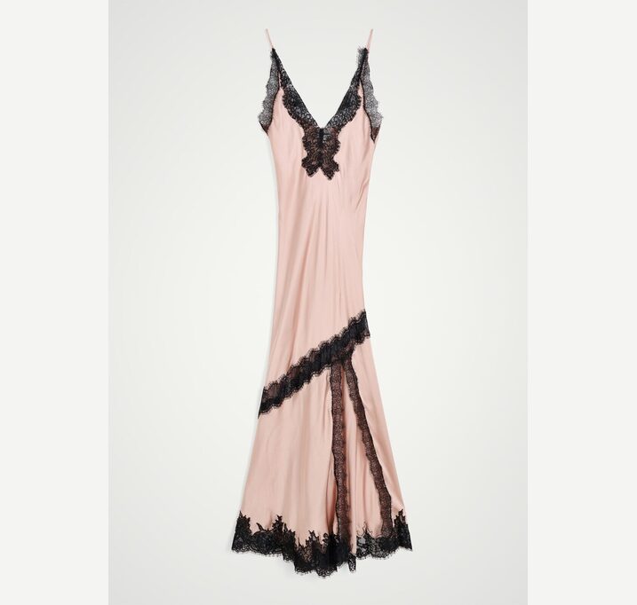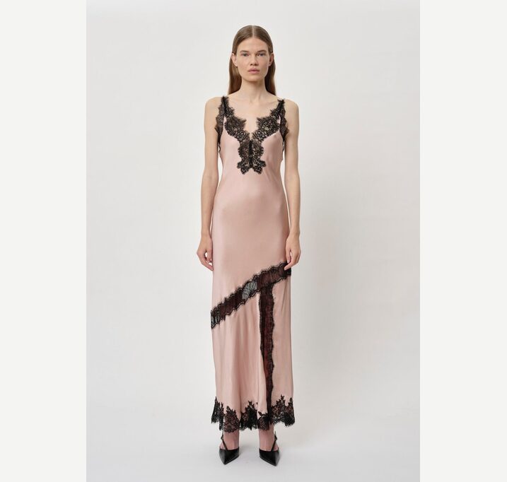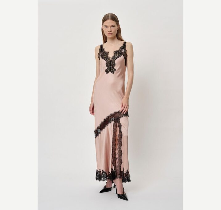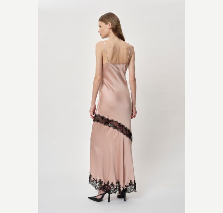 DESCRIPTION: Introducing the Nelly Dress: A long strap dress featuring diagonal lace details, with lace accents at the neck, slit, and bottom. The dress also includes a front slit.
