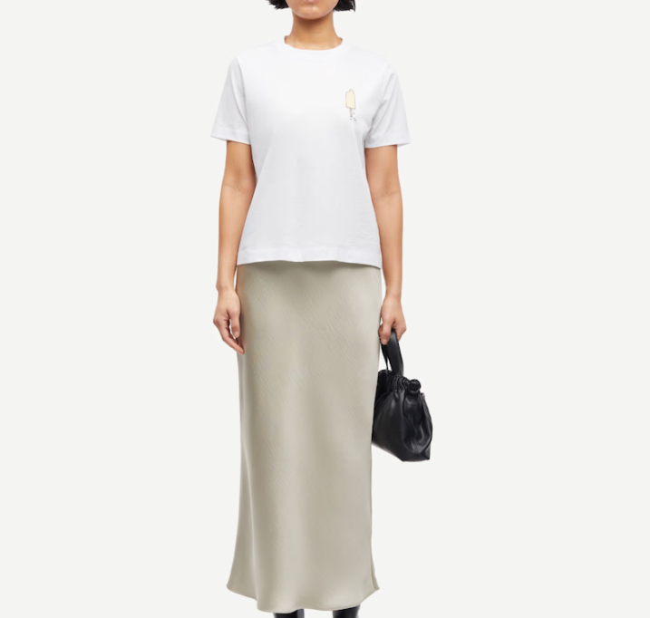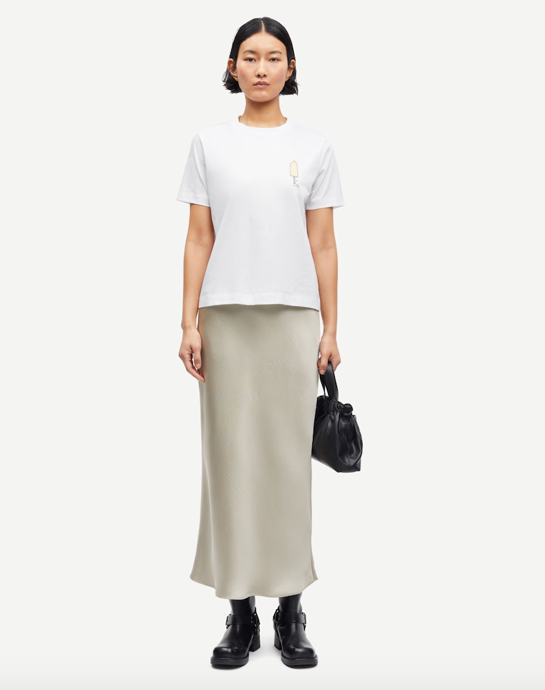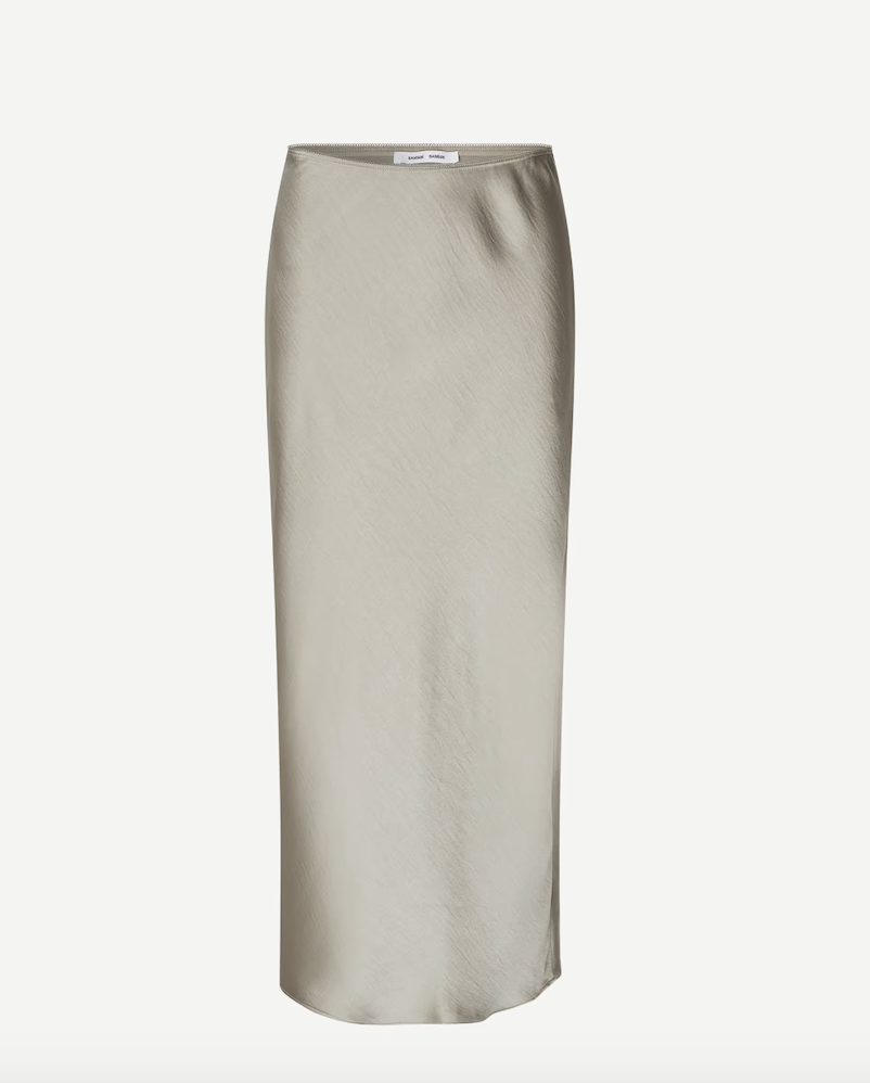 DESCRIPTION: Satin maxi skirt with a slim fit. Elastic waistband. Main material made from 100% recycled polyester. This product is GRS certified. Each stage of the supply chain has met strict social, environmental, and chemical requirements.