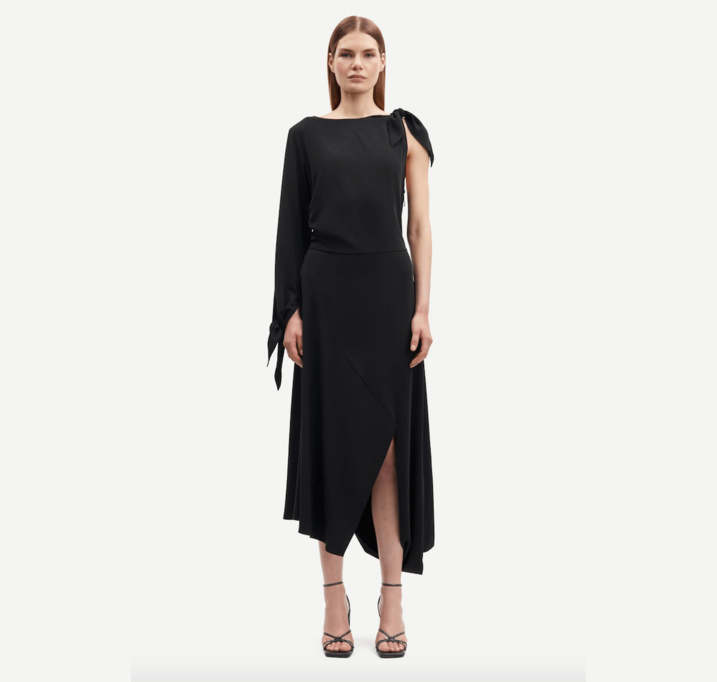 DESCRIPTION: Asymmetrical maxi dress with a regular fit. Self-tie on the shoulder and at the cuff of the long sleeve. Skirt with a wrap look to create movement. Main material made from 100% recycled polyester. This product is GRS certified. Each stage of the supply chain has met strict social, environmental, and chemical requirements.