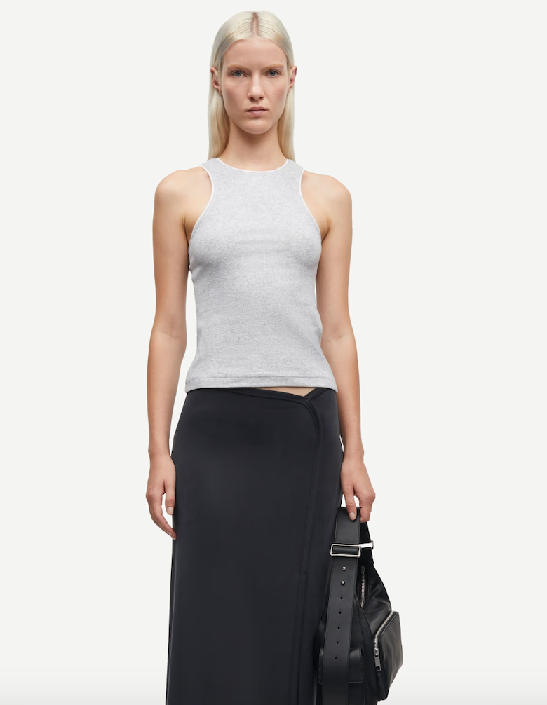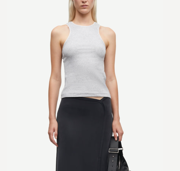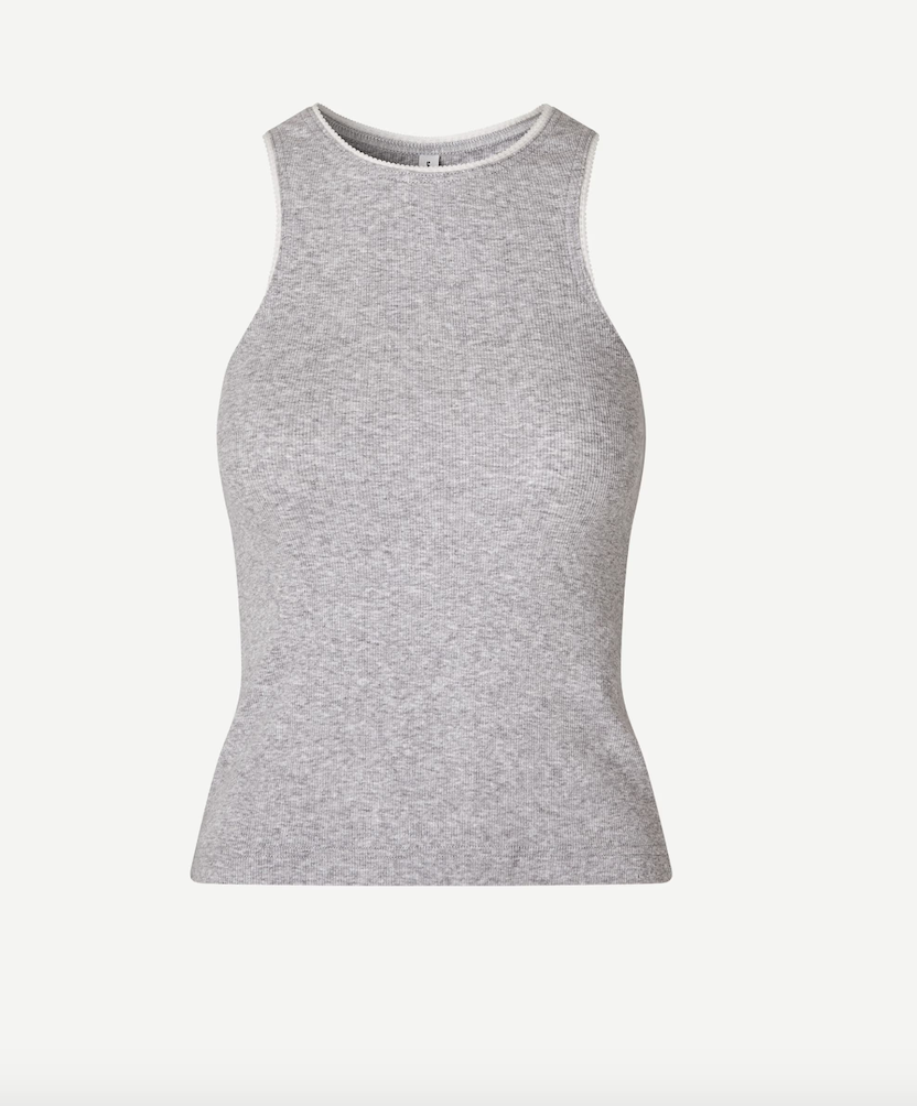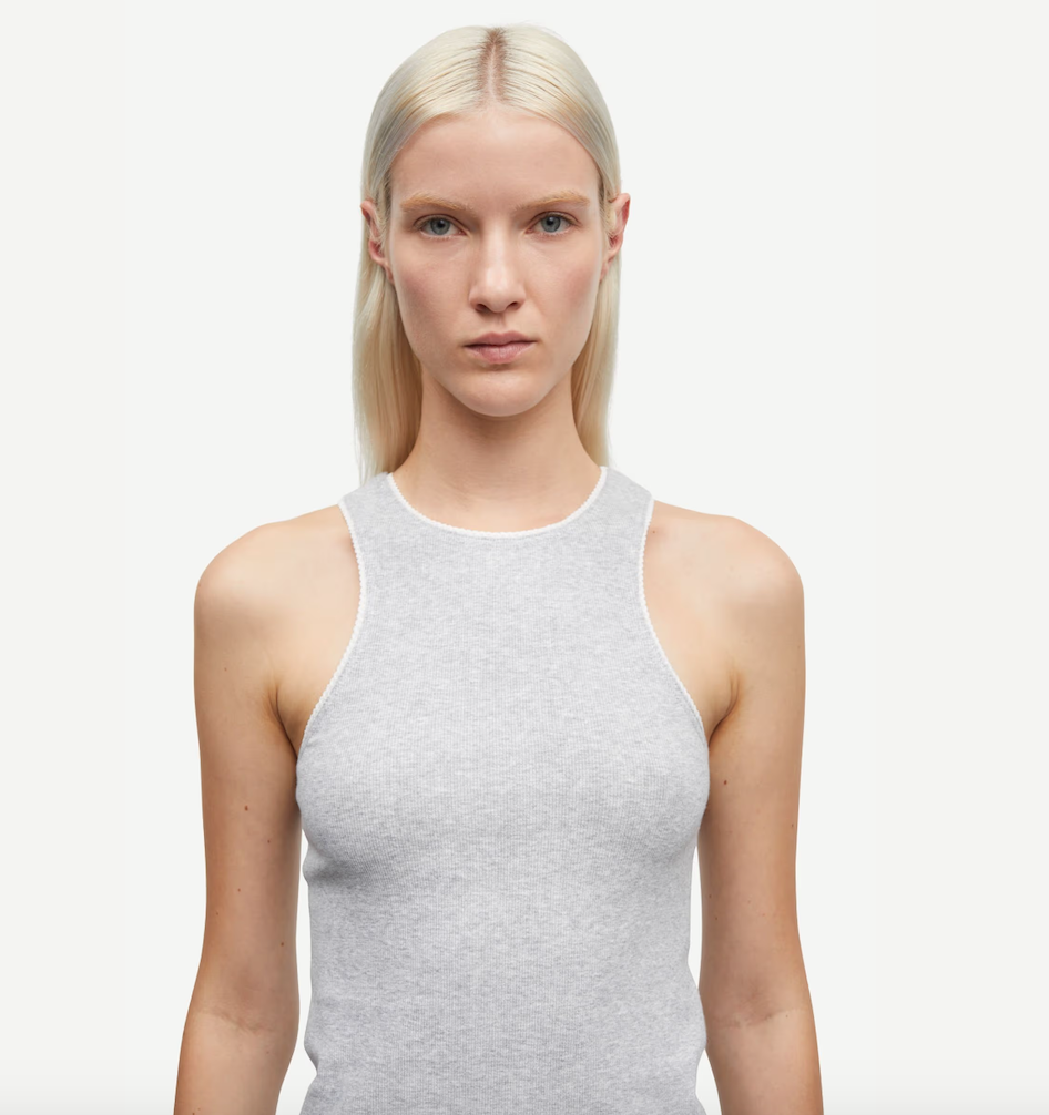 DESCRIPTION: Tank top with a slim fit. Crew neck. Scalloped trims at the neck and arms. Main material made from an elastic blend of organic cotton. This product is GOTS certified. Each stage of the supply chain has met strict social, environmental, and chemical requirements.