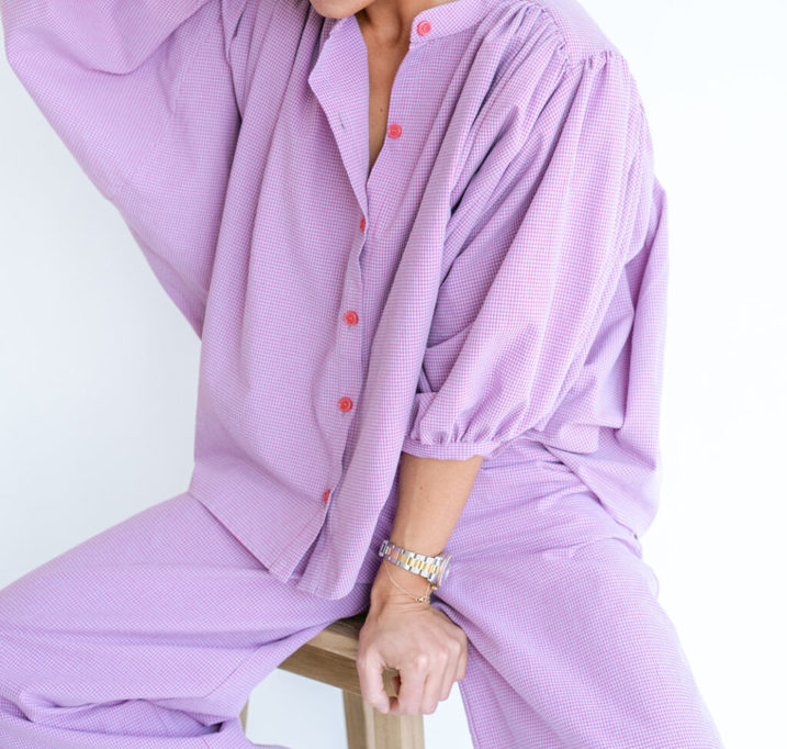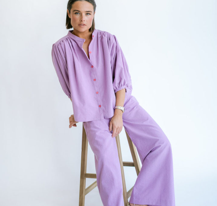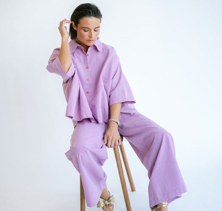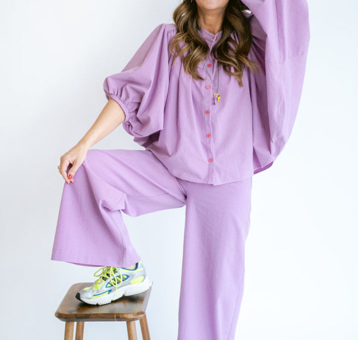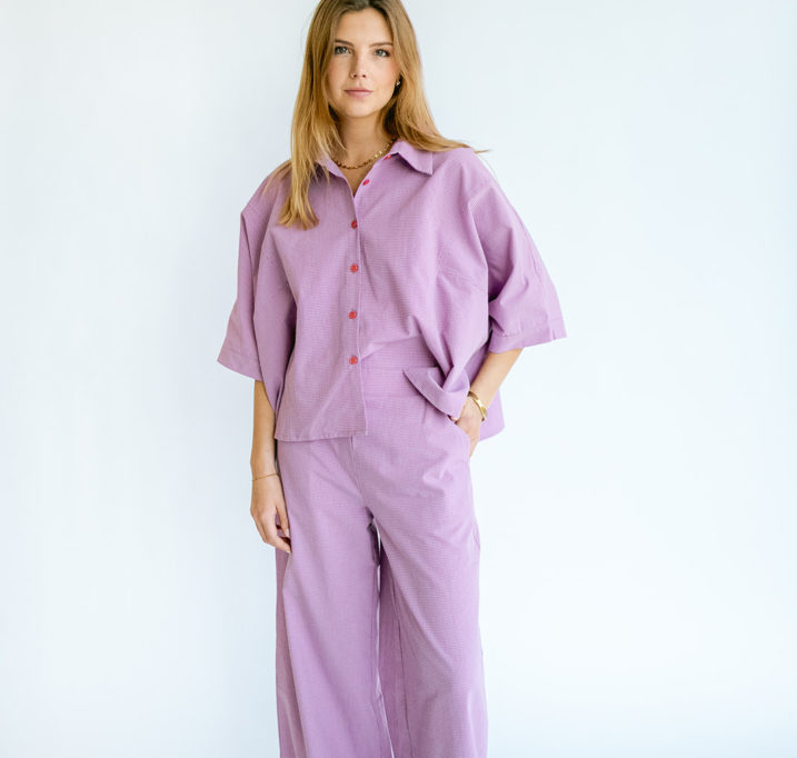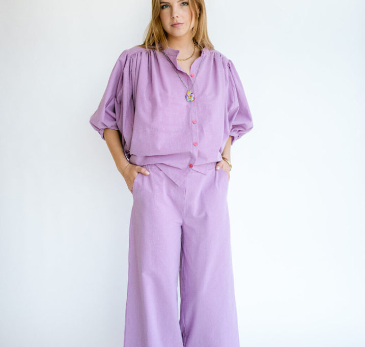 DESCRIPTION: Wide leg trousers in a small fuchsia check. These trousers have an elastic at the back of the waistband that ensures a nice fit. Combine with a white Viktor Bonheur t-shirt or go for a full look in combination with the Mette blouse in the same check.