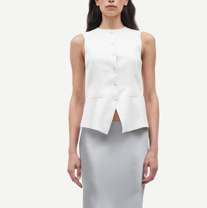 DESCRIPTION: Vest with a regular fit. Button closure on the front. Faux welt pockets on the front. Round neck. Main material made from an elastic blend including recycled polyester. This product is GRS certified. Each stage of the supply chain has met strict social, environmental, and chemical requirements.