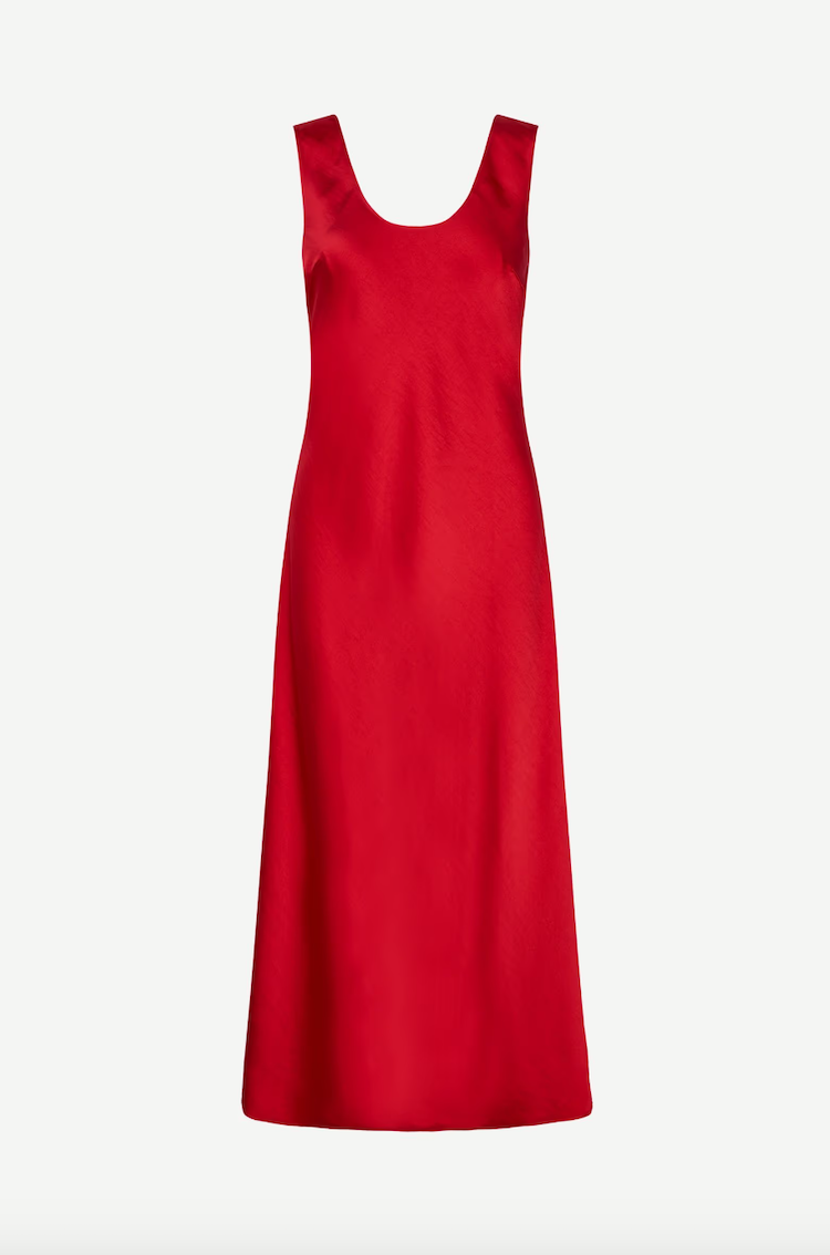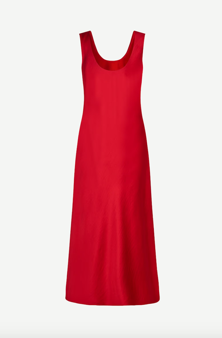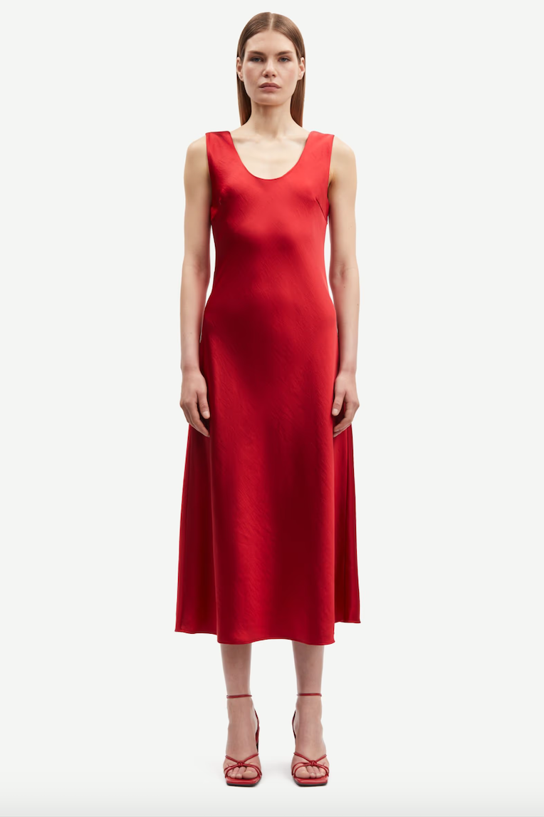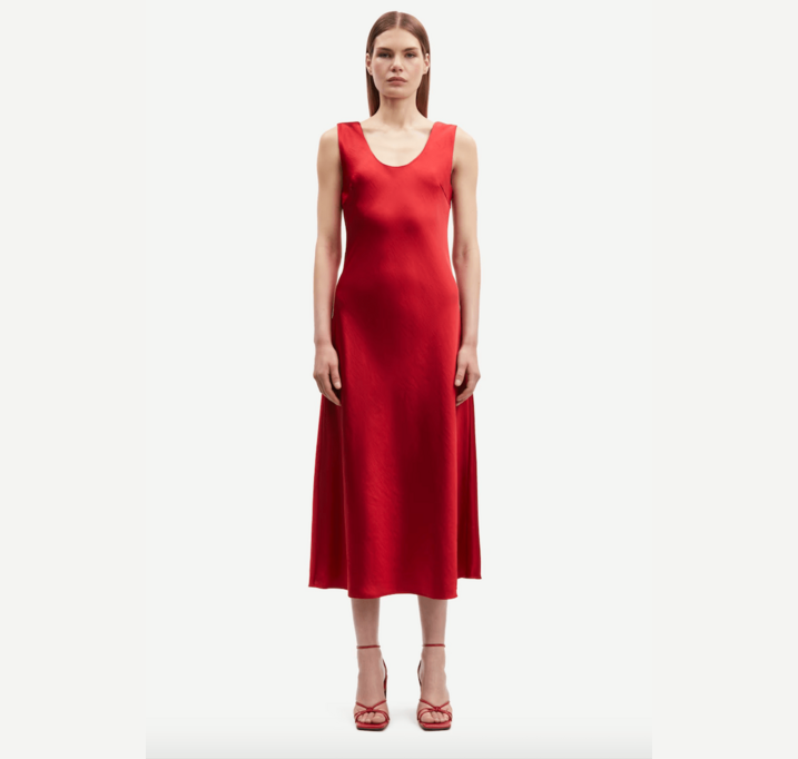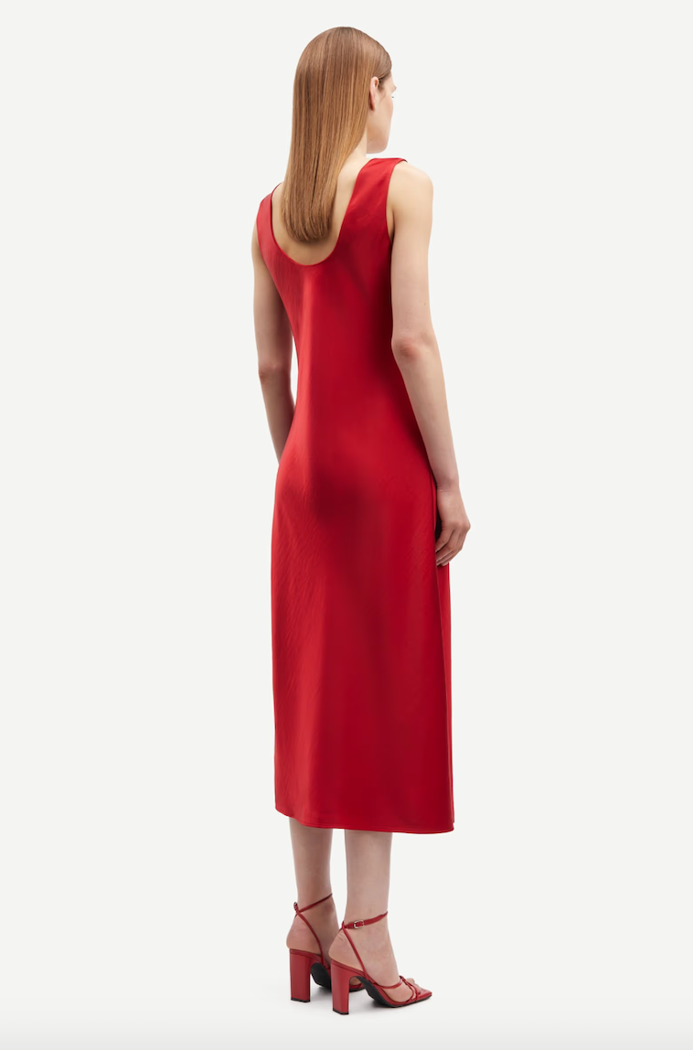DESCRIPTION: Satin midi dress with a regular fit. Round neck and back. Main material made from 100% recycled polyester. This product is GRS certified. Each stage of the supply chain has met strict social, environmental, and chemical requirements.