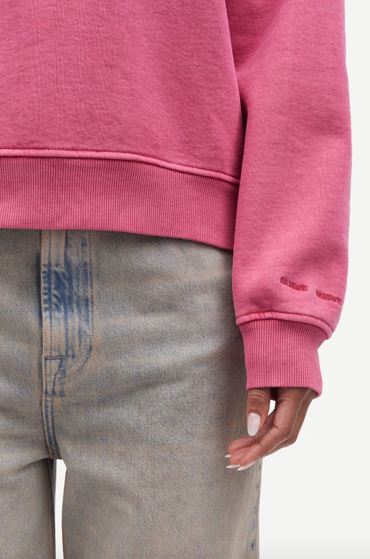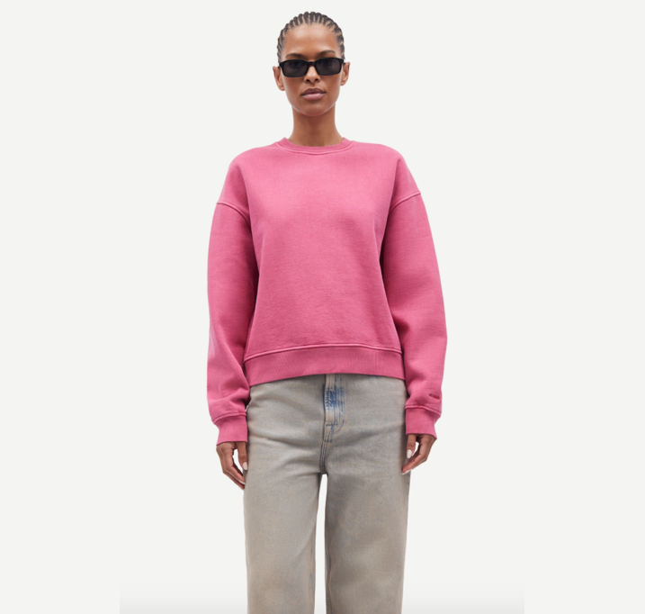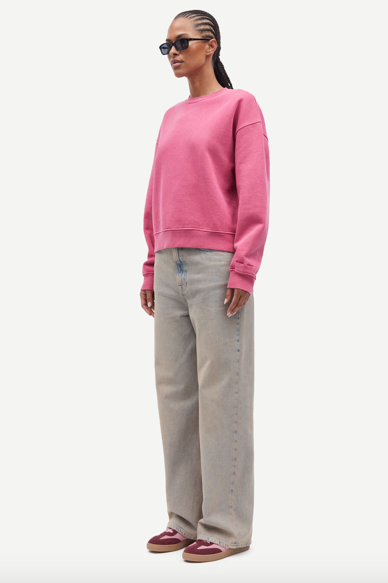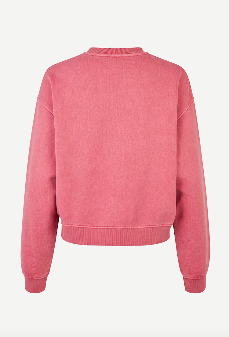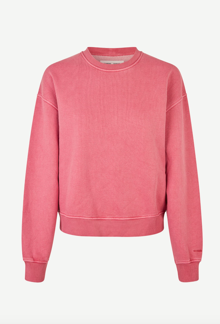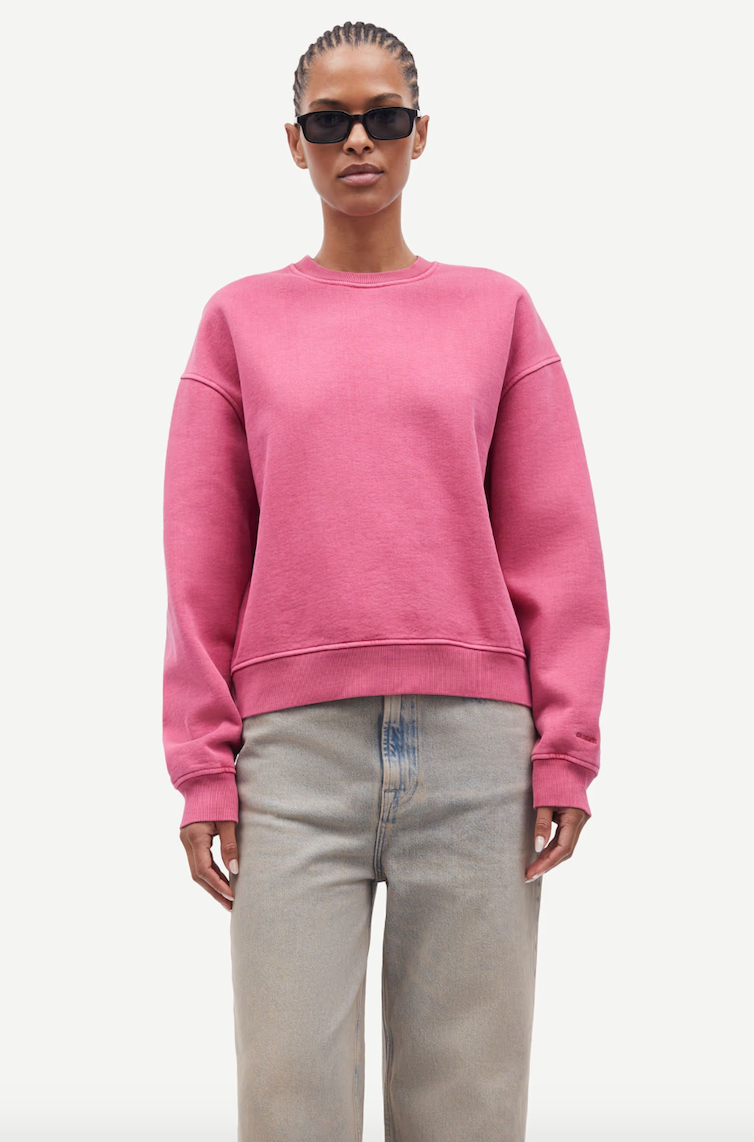 DESCRIPTION: Long-sleeved jersey sweatshirt with a loose fit and dropped shoulders. Rib-knitted collar, hem, and cuffs. Embroidered Samsøe Samsøe branding at the left cuff. Pigment dyed. Main material made from a blend including organic cotton and cotton.