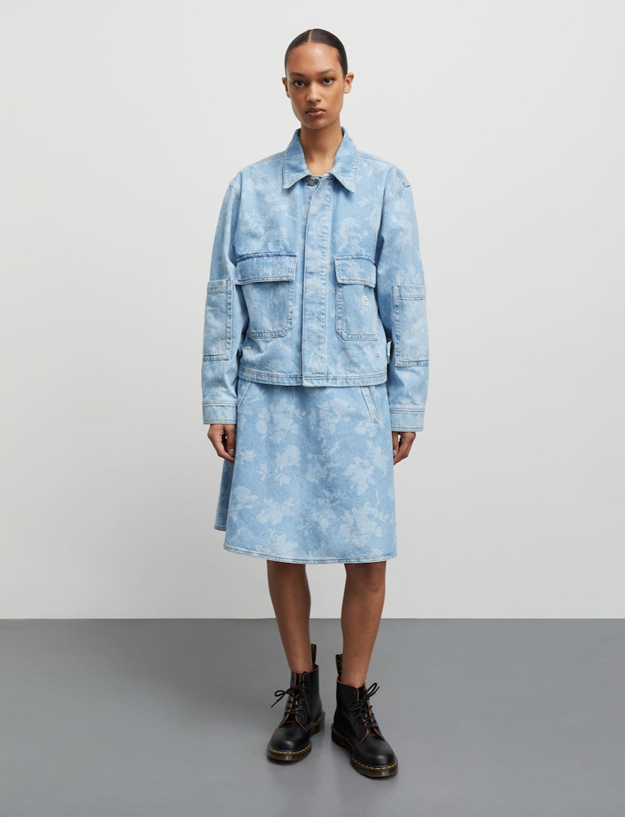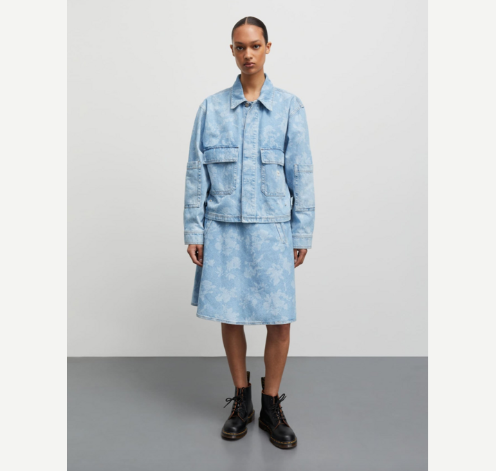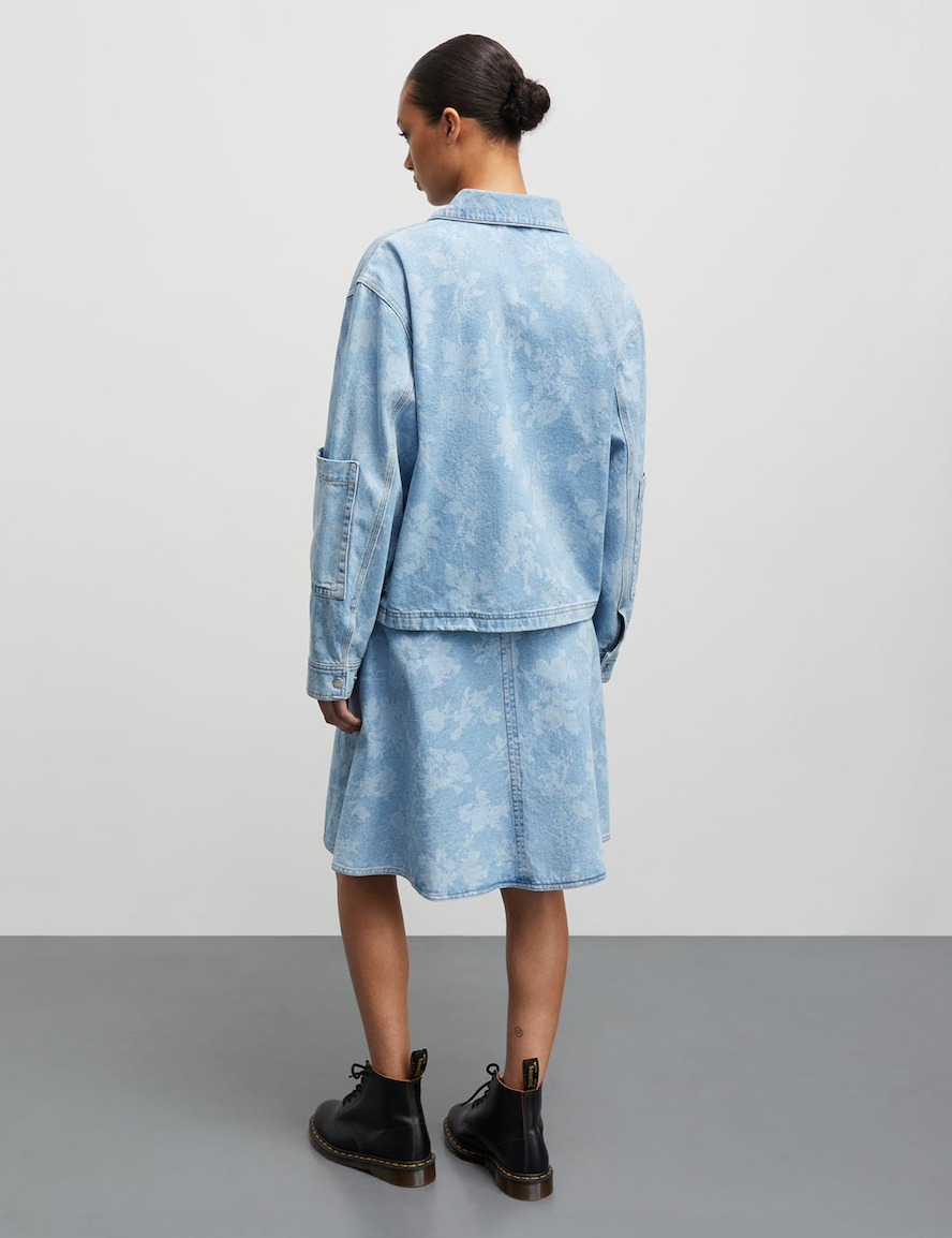 DESCRIPTION: Boxy oversized denim vest with a floral print. Adjustable waist.