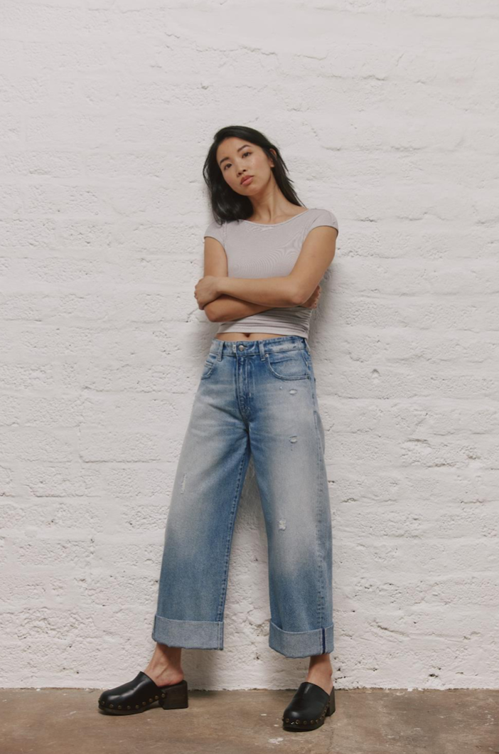 DESCRIPTION: The Denim 26_THE LOOSE comes in organic, authentic, rigid denim quality. It is in a classic blue/black-gray wash with lighter used effects and incorporated buffs. It has an extreme O-cut shape with wider legs with a higher, looser rise. Slightly shortened leg length thanks to a cuff. This shape can also be worn long.